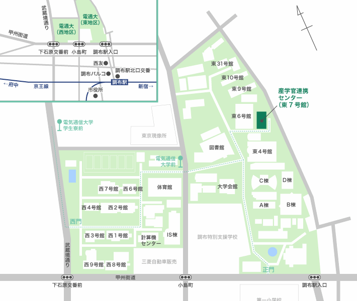 - 国立大学法人電気通信大学正門から産学官連携センターまで徒歩5分。