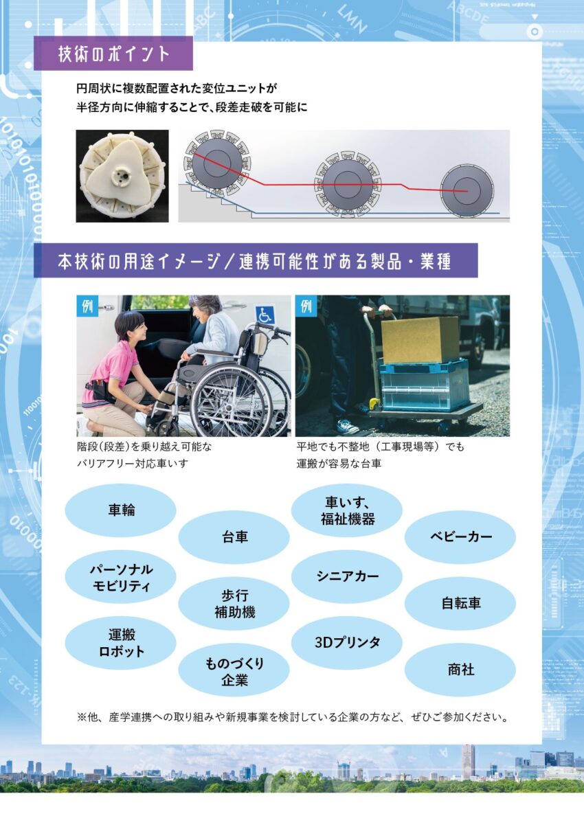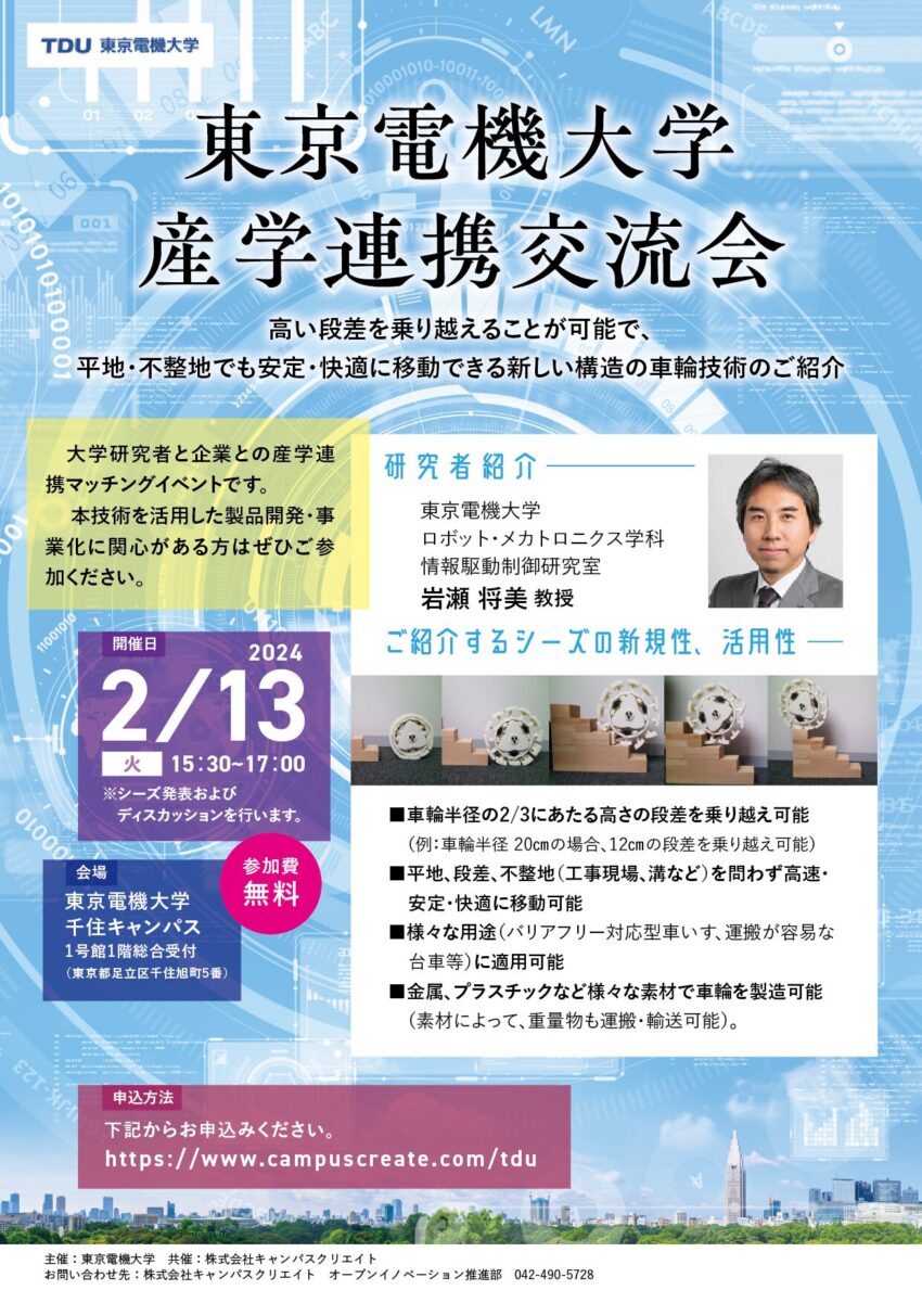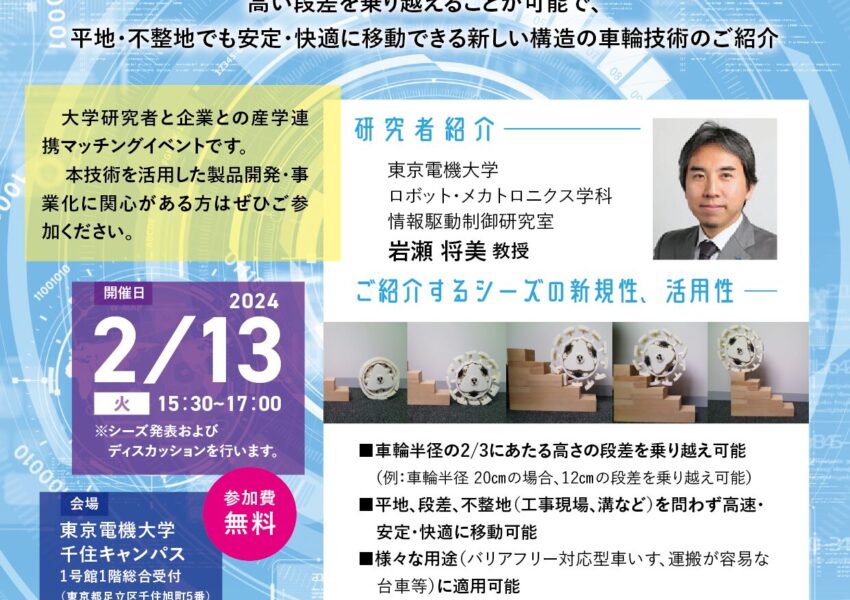 「2024年2月13日(火)15:30~17:00」、東京電機大学にて、「東京電機大学産学連携交流会 -高い段差を乗り越えることが可能で、平地・不整地でも安定・快適に移動できる新しい構造の車輪技術のご紹介-」を開催します。本技術シーズや産学連携に関心がある方はぜひご参加くださいませ。