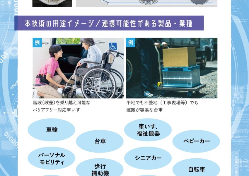 車輪、台車、車いす/福祉機器、ベビーカー、パーソナルモビリティ、歩行補助機、シニアカー、自転車、運搬ロボット、ものづくり企業、3Dプリンタ、商社など。