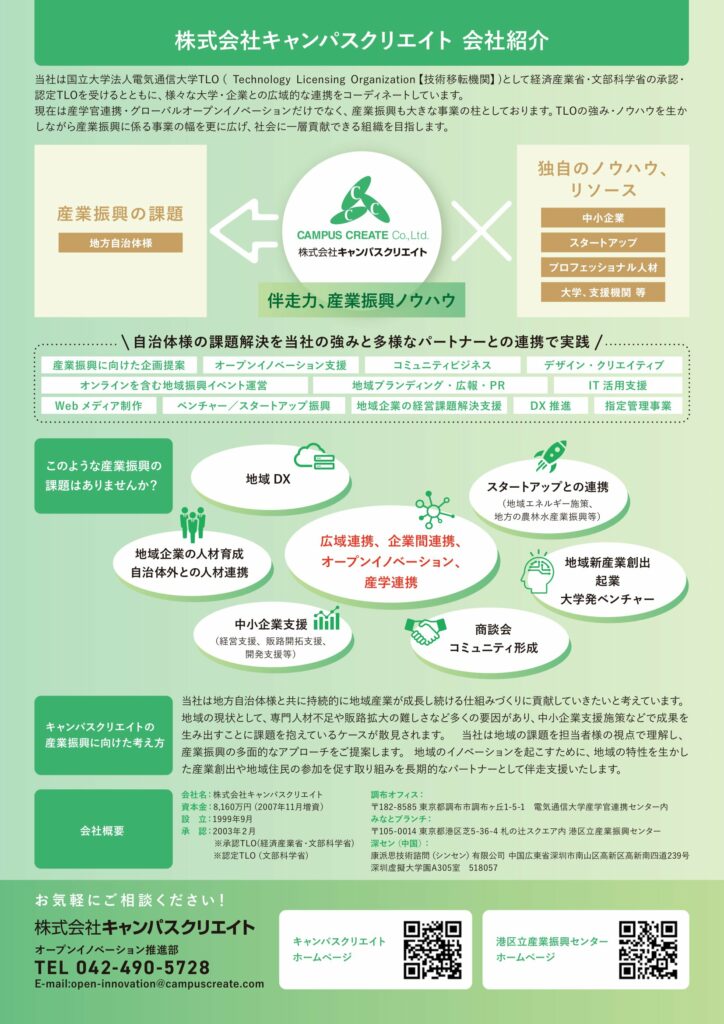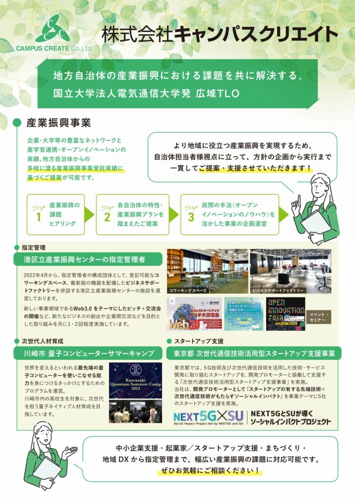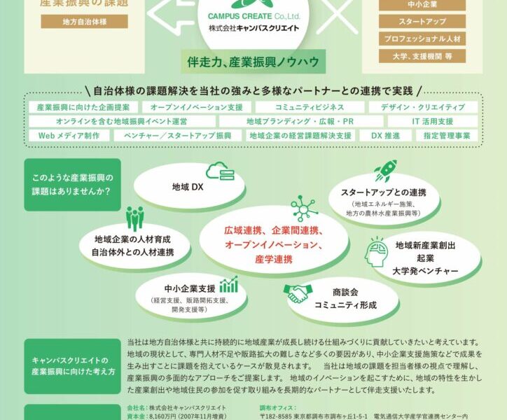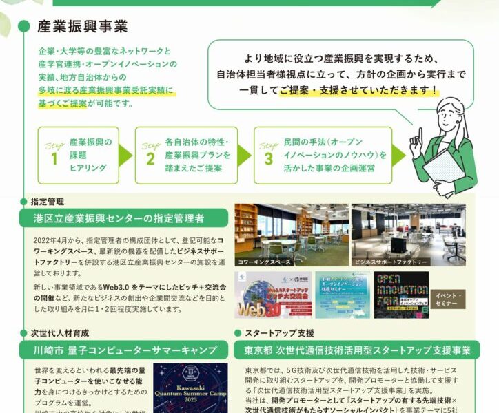 中小企業支援、起業家・スタートアップ支援、地域企業の人材育成から指定管理まで、幅広い産業振興の課題に対応可能です。