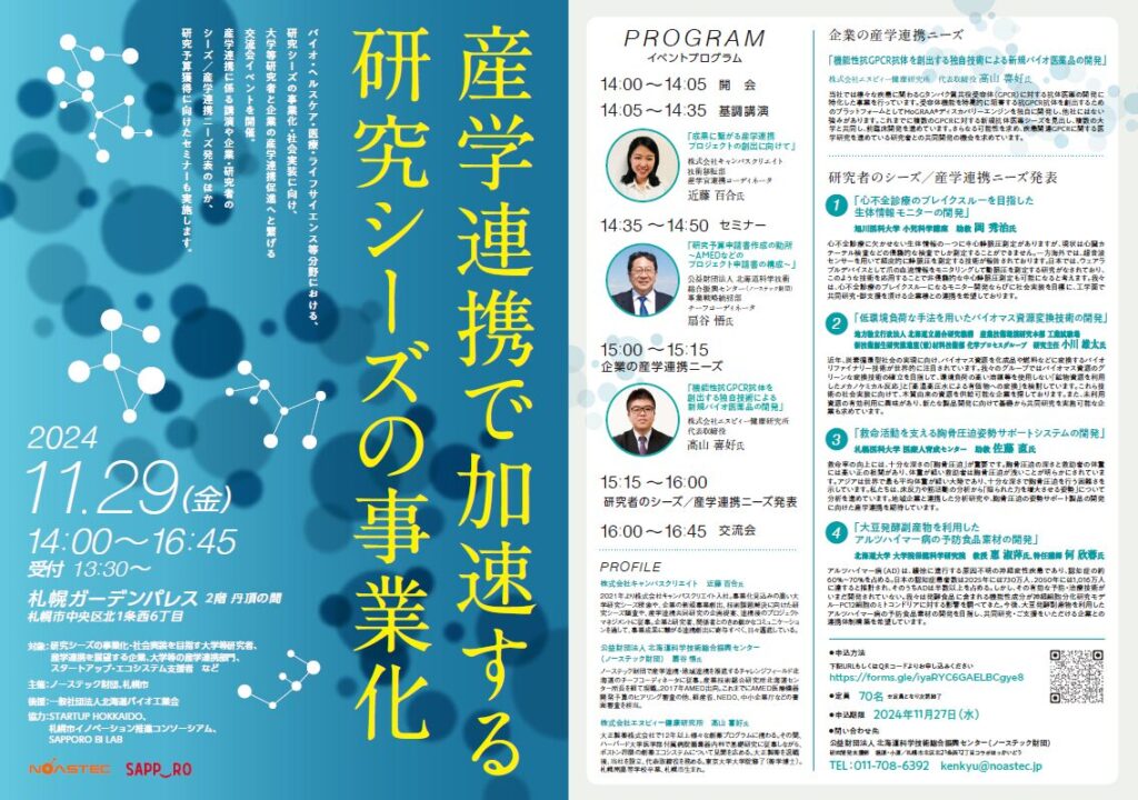 このたび、11月29日に札幌ガーデンパレスで開催される、ノーステック財団、札幌市主催の交流会イベント「産学連携で加速する研究シーズの事業化」にて、弊社 産学官連携コーディネータ 近藤がスピーカーとして登壇いたします。