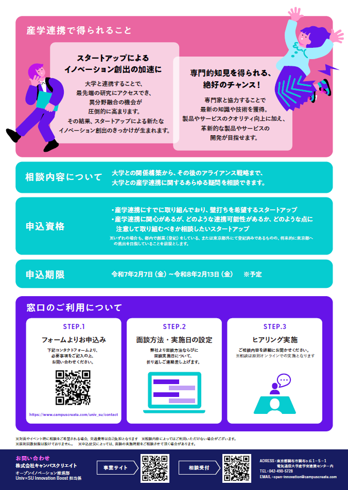 当社では、「Univ×SU Innovation Boost」の一環として、大学との産学連携に関心がある、またはすでに産学連携に取り組んでいるが、さらに連携の価値を高めたいスタートアップのための相談窓口を受け付けております。スタートアップは、産学連携に関して期待されていることの実現策・メリットを明確化したり、疑問や不安を解消することができます。