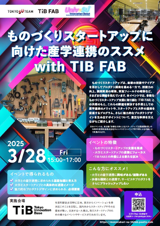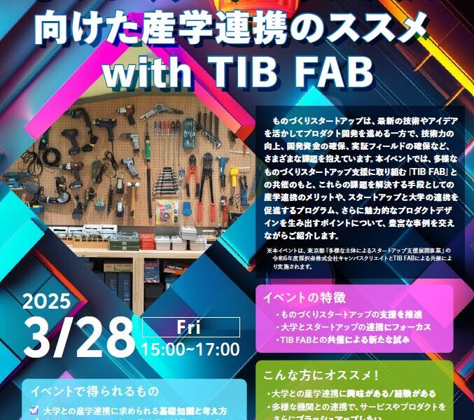 この度、2025年3月28日(金)にTokyo Innovation Base(TIB) 2F SABAにて、「ものづくりスタートアップに向けた産学連携のススメ with TIB FAB」を実施いたします。