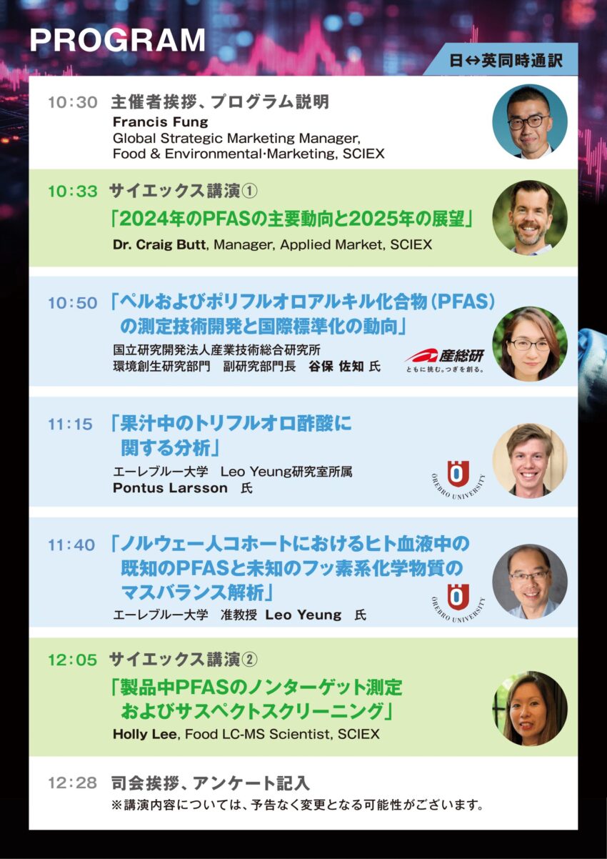 PFAS分析に関する最新の国際動向にご興味がある方や、PFAS分析手法を学ばれたい方、PFAS分析装置の検討について悩まれている方はぜひご参加ください。