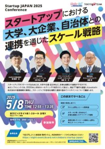 この度、その一環として、国内最大級のスタートアップイベント「Startup JAPAN 2025」(主催:Eight / Sansan株式会社 会場:東京ビッグサイト南展示棟1~2ホール)において、「スタートアップにおける大学・大企業・自治体との連携を通じたスケール戦略」をテーマとしたカンファレンスを主催いたします。