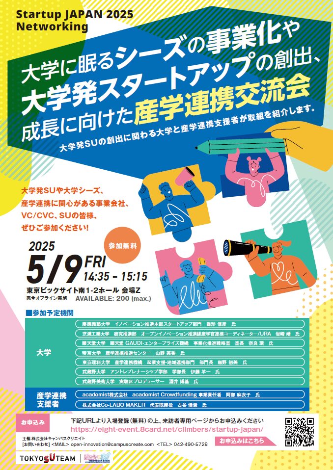 この度、その一環として、国内最大級のスタートアップイベント「Startup JAPAN 2025」(主催:Eight / Sansan株式会社 会場:東京ビッグサイト南展示棟1~2ホール)において、「大学に眠るシーズの事業化や大学発スタートアップの創出・成長に向けた産学連携交流会」を主催いたします。