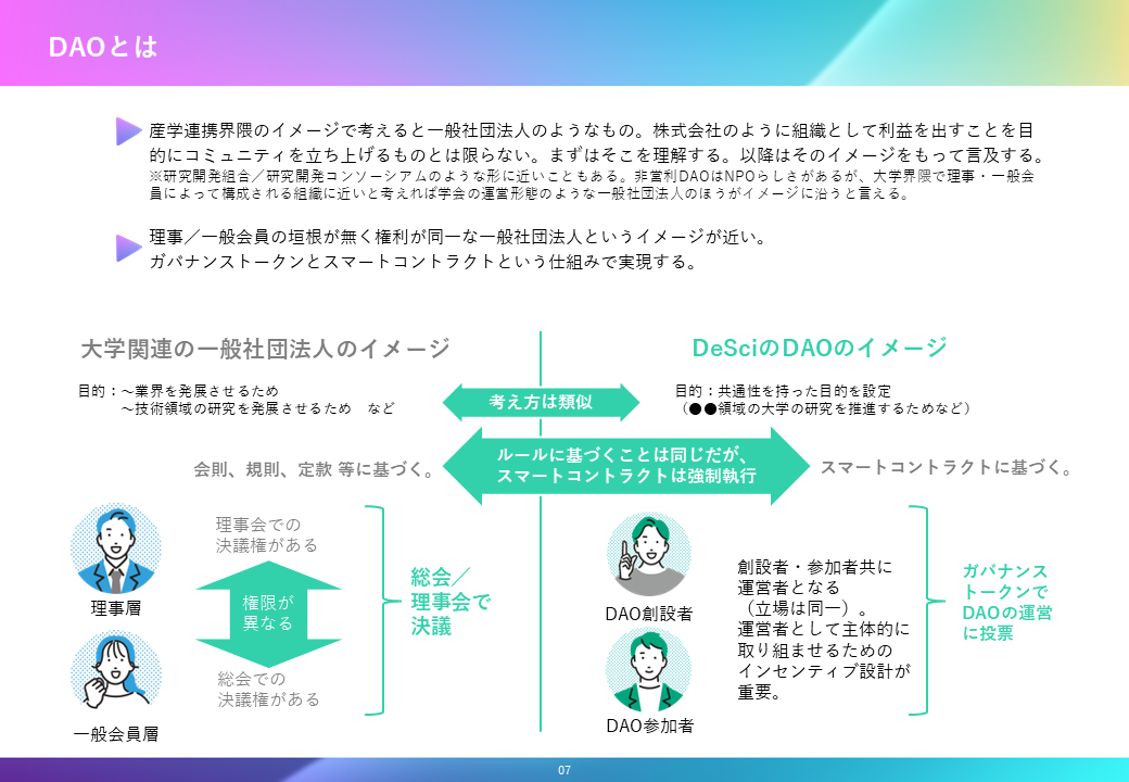 まずDAOは、一口で言えばコミュニティですが、産学連携界隈に携わる方の目線で考えると一般社団法人の形態で捉えるとイメージしやすいです。一般社団法人の中でも、学会のような特定の研究領域の振興、特定の技術領域の普及啓発活動(研究開発コンソーシアムなど)、特定の業界の普及啓発活動などの取組がDeSciのイメージに近いです。DAOは株式会社の基本形態のように、必ずしも組織として利益を出すことを目的にコミュニティを立ち上げるものではなく、その点をまず理解する必要があります。