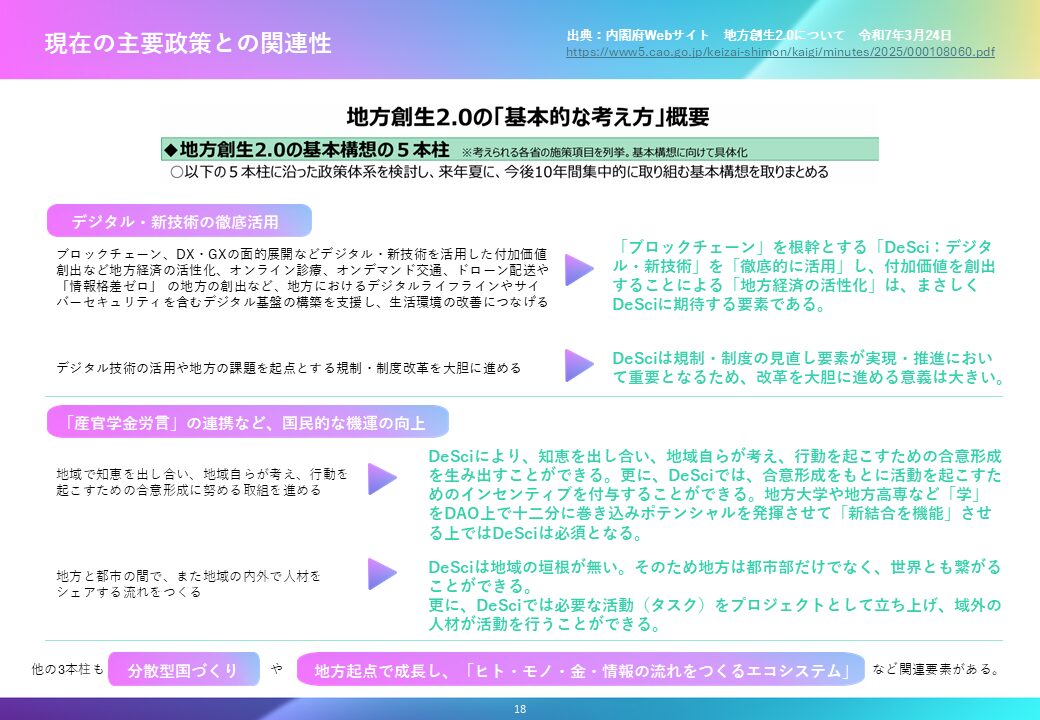 また、知財流通と別の観点でDeSciを捉えると、DeSciはSociety5.0の定義である「サイバー空間とフィジカル空間を高度に融合させたシステムにより、経済発展と社会的課題の解決を両立する、超スマート社会」を実現する上でのサイバー空間に該当し、特に「総合知」のカテゴリに該当します。様々な政策と親和性が高く、政策を推し進める効果も期待できます。