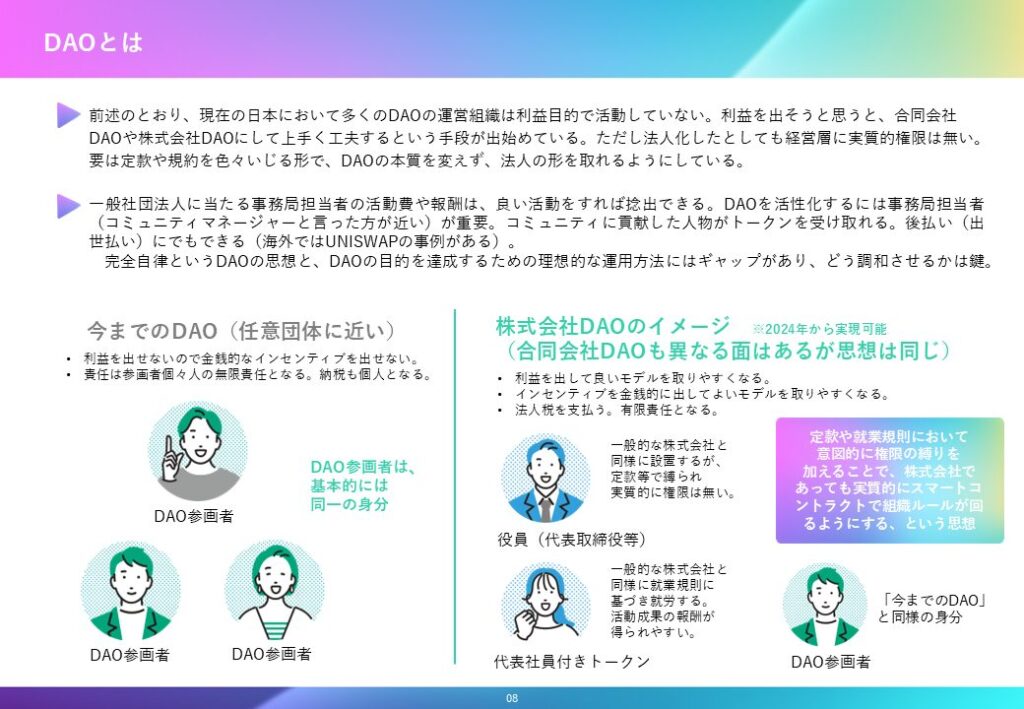 現在の日本において多くのDAOは前述のとおり利益目的で活動していません。一方でそれだけではDAOを立ち上げ、盛り上げようとする人材の活動にインセンティブが発生しづらかったり制限が掛かってしまう点があり、より発展性の幅を持たせられるよう利益を取りやすい仕組みが必要です。