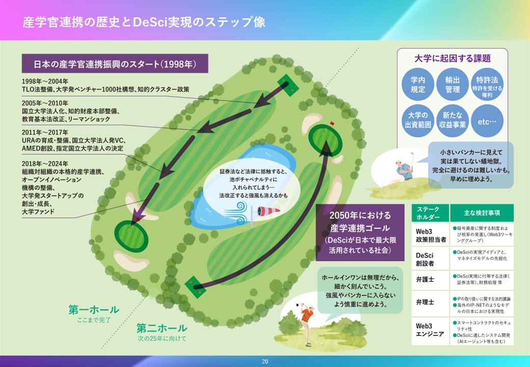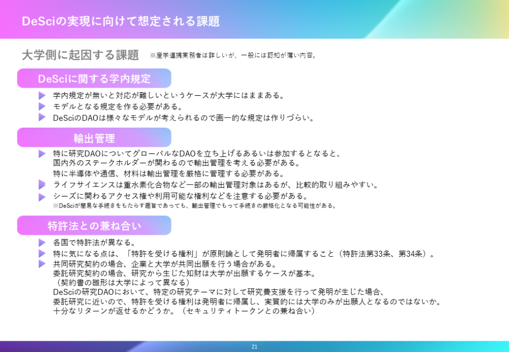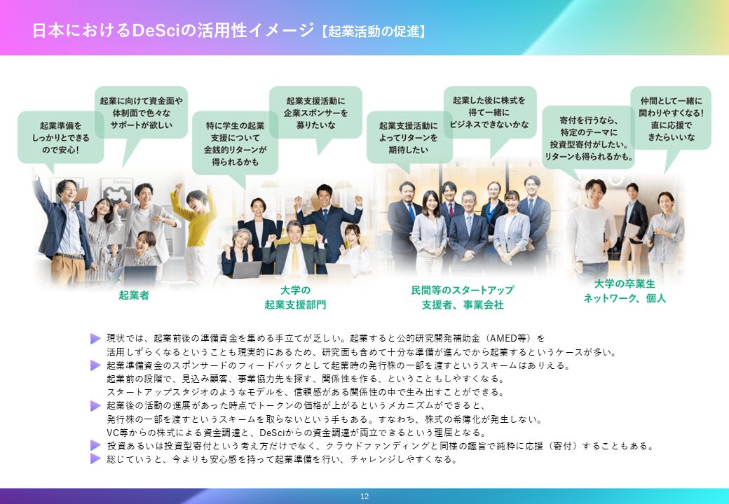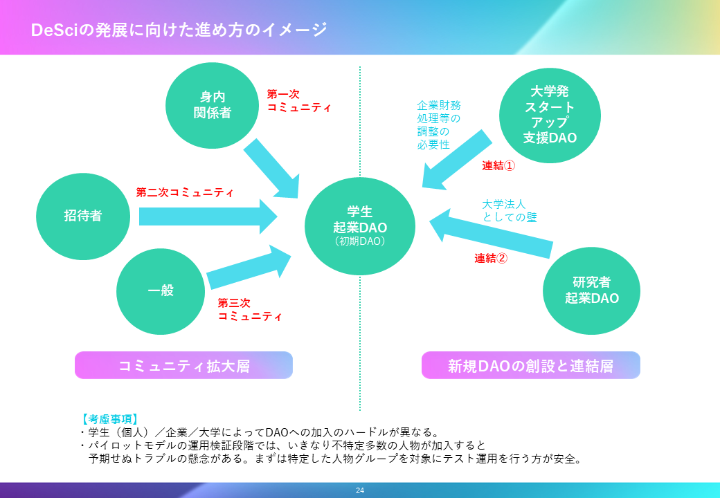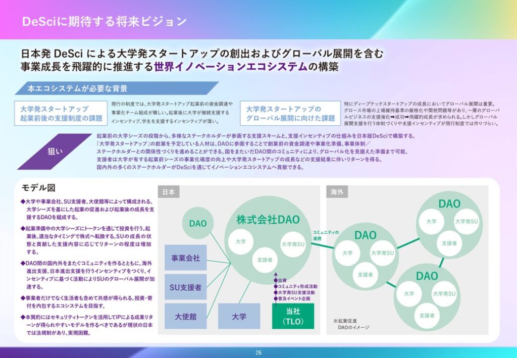 DeSciは日本ではまだまだ一部の検討段階であることは間違いなく、海外では学会でも大きな注目を集めているものの日本では論文投稿実績は非常に限定的であり、政策的な議論もほぼありません。一方で大学や産学連携の実務には大きな矛盾や課題が依然として残っており、「成り行きの未来」にゆだねず、解決の策を能動的・継続的に探していくことが重要だと考えています。本リリースでは、重複した意味の文章・表現をいくつか含んでいますが、文章として読みやすくするよう配慮した部分もありますが、メリットや課題事項に共通性があるという点も挙げられます。「日本発DeSciによる大学発スタートアップの創出およびグローバル展開を含む事業成長を飛躍的に推進する世界イノベーションエコシステムの構築」も構想としては壮大ですが、その実現に当たっての課題は、寄付制度への投資性の付与や、起業前段階に得たトークンを法人設立後に株式に転換する、セキュリティトークンの取り扱いの整備など、単発のDAOモデルと工夫すべき点は共通です。DeSciへの取組を産学官連携で着実に検討していけば、エコシステム像も自然と実現に前進していきます。とどのつまりは推進者の存在と活動量、共感性のあるビジョンが実現の鍵となるでしょう。本リリースで掲げたDeSciのモデルはあくまで例示であり、発想性が豊かで行動力、社会問題解決への熱意、アントレプレナーシップを持つ学生や若手社会人の方を中心に、DeSciの実現に関心を持っていただくことを期待します。