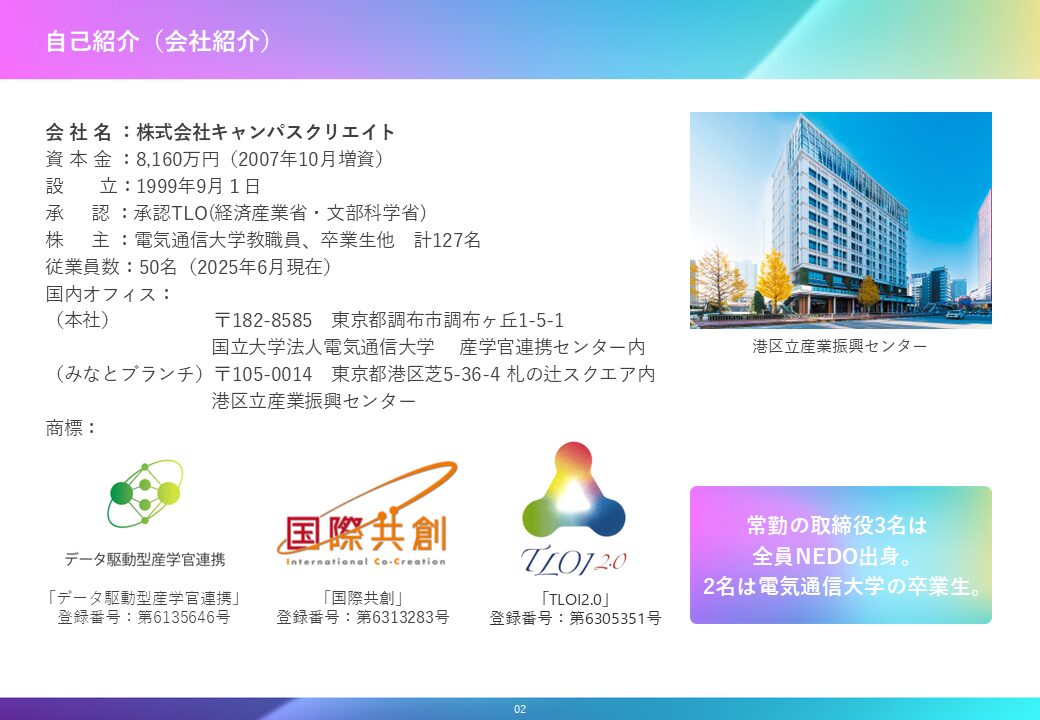 当社は電気通信大学TLOかつ広域TLOとして、産学連携事業や産業振興事業を推進しています。常勤の役員3名全員がNEDO(独立行政法人新エネルギー・産業技術総合開発機構)の出身であり、産学連携業界全体の振興にも力を入れていることが特徴です。「データ駆動型産学官連携」「国際共創」「TLOI2.0」の商標を取得しており、産学官連携の推進におけるIT・データの活用やグローバルオープンイノベーションの推進、技術移転モデルの新しい手法について実践と検討を日々進めています。