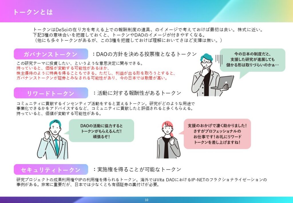 セキュリティトークンは非常に重要ですが、日本では少なくとも有価証券の裏付けが必要であり実現には先が長い話となります。ここでは割愛しますが、セキュリティトークンはDeSciの大きな要となるため、そのようなトークンがあることだけ知っておくと将来像を立てやすくなります。