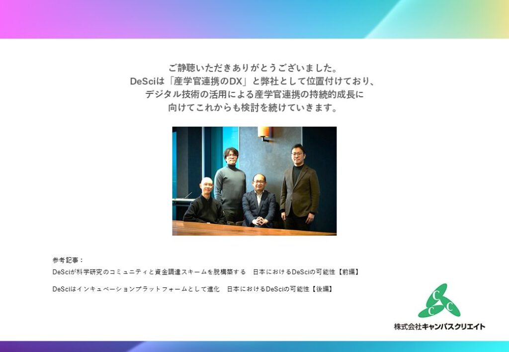 発表資料の著作権が発表者にあることを踏まえ、資料も含めて公開しました。DeSciは「産学官連携のDX」として当社は位置付けており、不確か性はあるものの大きな可能性を秘めています。当社は「データ駆動型産学官連携」を推進するにあたり、生成AIやAIエージェントだけではなく、DeSciについて継続的に検討を進めていきます。なお、海外ではDeSciにおいてAIエージェントの活用を進めている取組もあります。