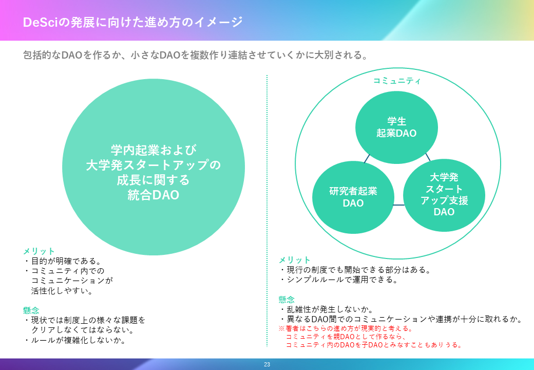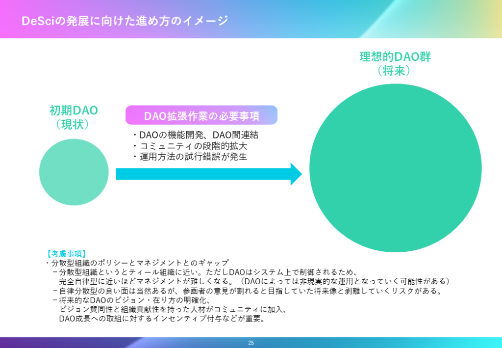 小さいDAOを作り、連結させながらDeSciを実現していくイメージを説明します。