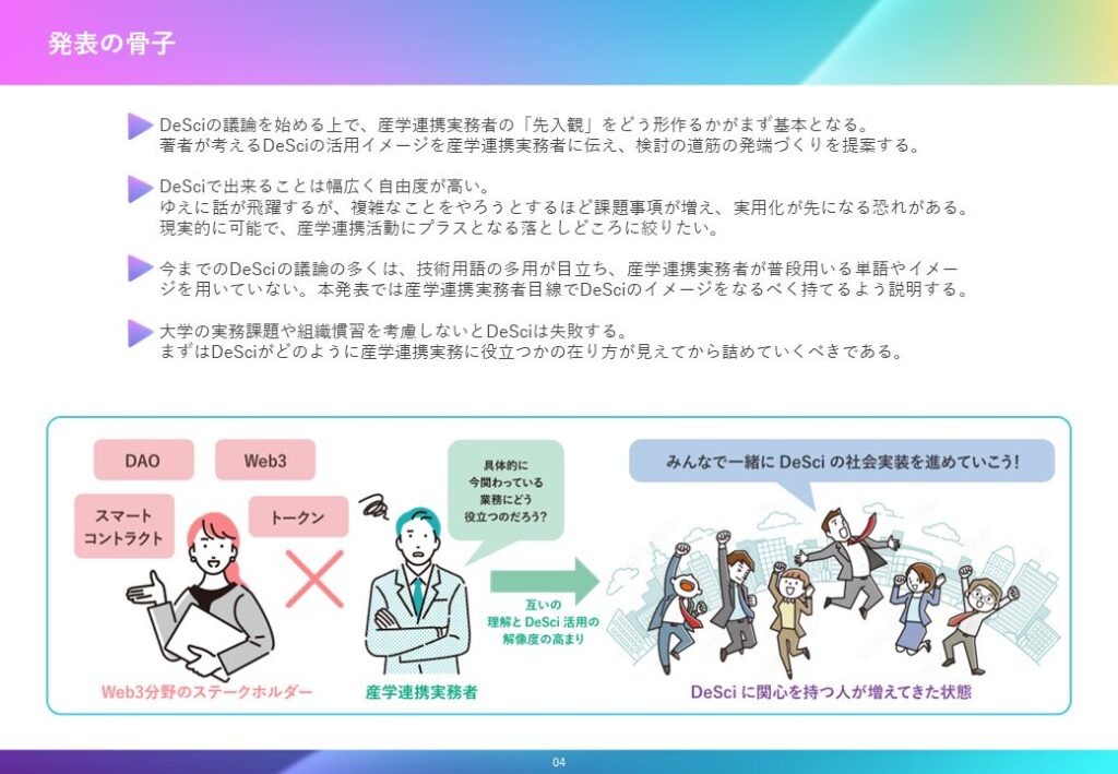 DeSciはWeb3業界において注目を集めているものの国内の産学連携業界ではほぼ知名度が無いキーワードです。Web3業界特有の技術用語を用いて議論がなされることが多く、現場に立つ産学連携実務者にとってどのような活用性があるか、理解を促進することは容易ではありません。また、DeSciは非常に大きな可能性を秘めているものの、法的制度や規制、大学特有の慣習などがDeSciの社会実装において課題となる中で、その情報を抜きにDeSciの在り方を語ったとしても現実味のある社会実装ストーリーとはならず、納得性や着実性に欠け、関係者のコンセンサスが取れず議論や取組が停滞する状況に陥るリスクがあります。そこで本発表では、産学連携実務者にとっての「先入観」をどう形作るかがまず基本となると考え、産学連携実務者の目線に立って、どのような基礎的な理解と期待感を持ち、どのように検討を進めていくかの提案を行うことを骨子としました。DeSciの実現には、Web3分野のステークホルダーと産学連携実務者の相互理解と協調が必須となります。DeSciに関心を持つ人材が増えてきた状況を作りだすことがまず先決と考えています。