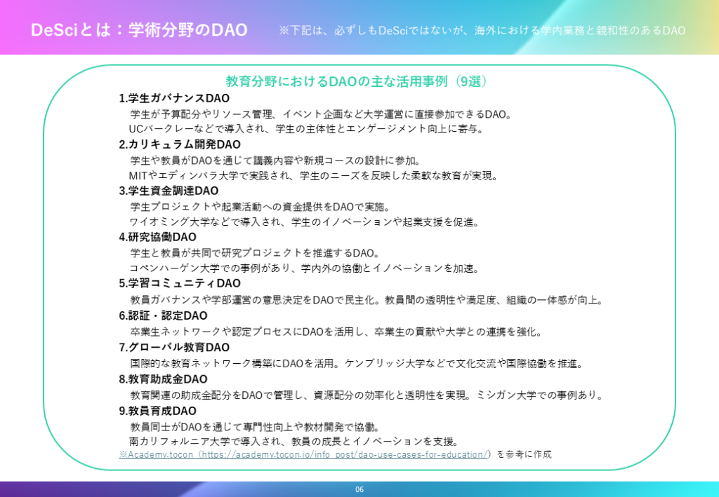 研究系DAOについて説明したことで、イメージが少し湧いてくるかもしれません。一方で誤解を与えてはいけないことは、DeSciには様々なDAOがあり、Desciとは必ずしも定義されないが学内業務と親和性のあるDAO(例えば教育系)も世界では様々な取組があるということです。発想を狭める必要が無いことも持つべき先入観の一つです。