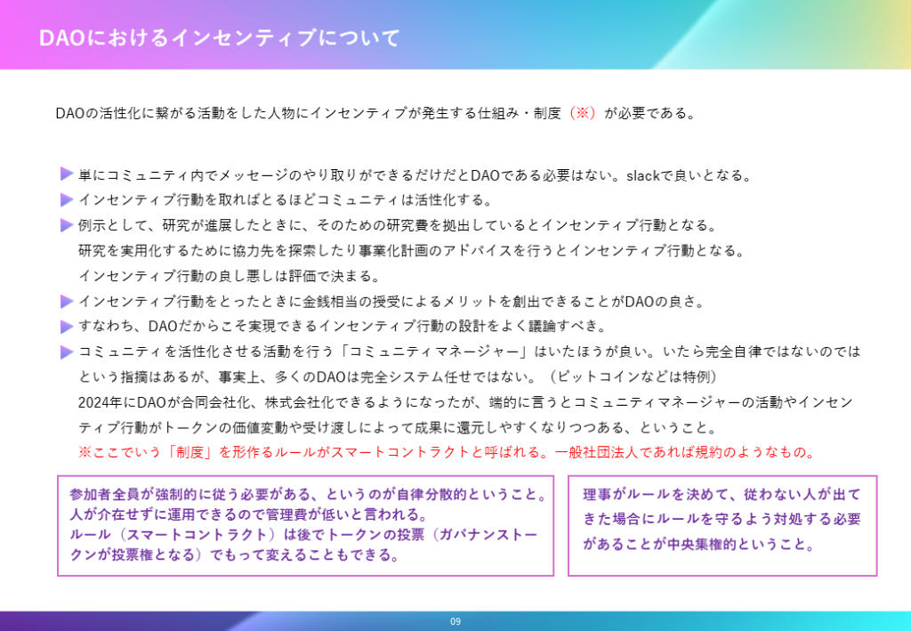 ここでいうインセンティブ行動として、例えば発表スライド5でイメージとして挙げた研究DAOであれば、DAOのビジョン達成に向けて研究を行っているテーマについて、研究費の拠出という行為はインセンティブ行動となります。研究を実用化するために協力先を探索したり事業化計画のアドバイスを行うこともインセンティブ行動となります。インセンティブ行動の良し悪しは評価で決まります。評価結果は見える化されるため、コミュニティの活性化へ多くの貢献を行ってきた人物の評価はコミュニティ内で周知されることになります。インセンティブ行動の報酬として金銭相当のメリットを創出できることがDAOの良さの一つです。つまり、DAOだからこそ実現できるインセンティブ行動の設計をよく議論すべきです。このようなインセンティブ行動を触発させる上で、コミュニティを活性化させる活動を担う「コミュニティマネージャー」はいたほうが良いという考えです。法人型DAOが設立可能になったことへ期待できる要素となります。
