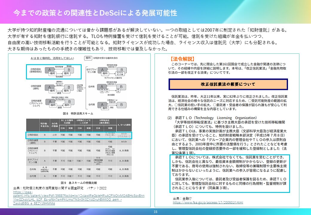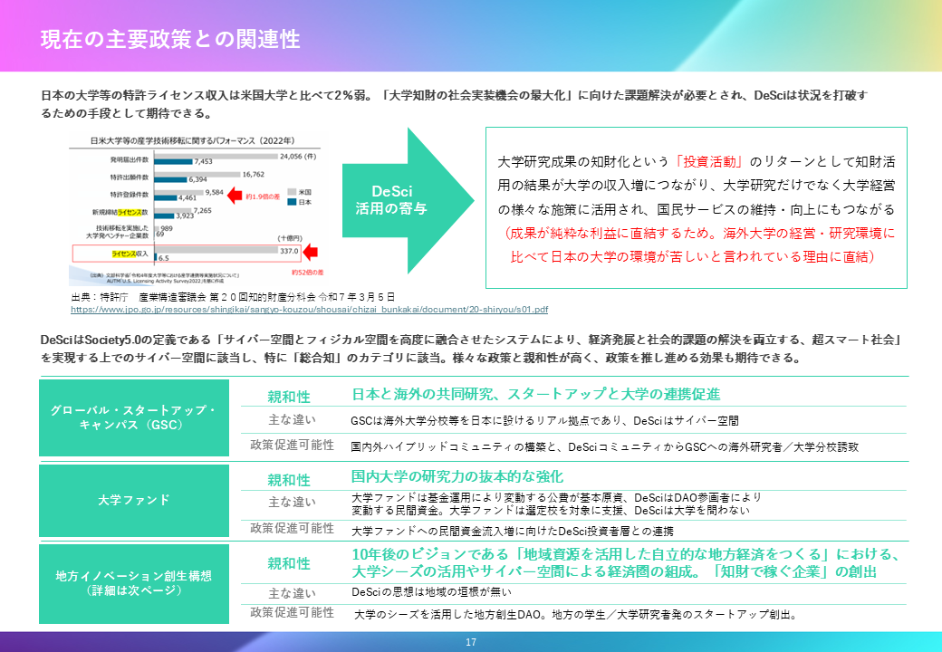 前項では過去の政策との対比から、今まで難しかった知財流通活動へのDeSciの活用性について述べました。現在の主要政策との関連性について触れます。引き続いての知財流通の観点で見ると「日本の大学等の特許ライセンス収入」は米国大学と比べて2%弱にとどまります。特許庁の資料(下記URLの23ページ)では「大学知財の社会実装機会の最大化」に向けた課題解決が必要とされます。