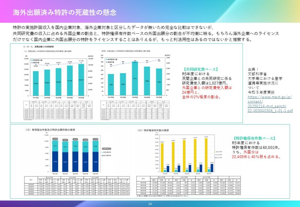 ここで、日本の大学における海外企業との連携実績や知財の活用状況について考えます。共同研究費ベースでは、R5年度における民間企業との共同研究に係る研究費受入額は1,027億円とされ、うち、外国企業との研究費受入額は24憶円と、全体の2%程度の割合にすぎません。それに対し、R5年度における特許権保有件数は60,001件とされ、うち、外国分は22,405件と40%弱を占めます。