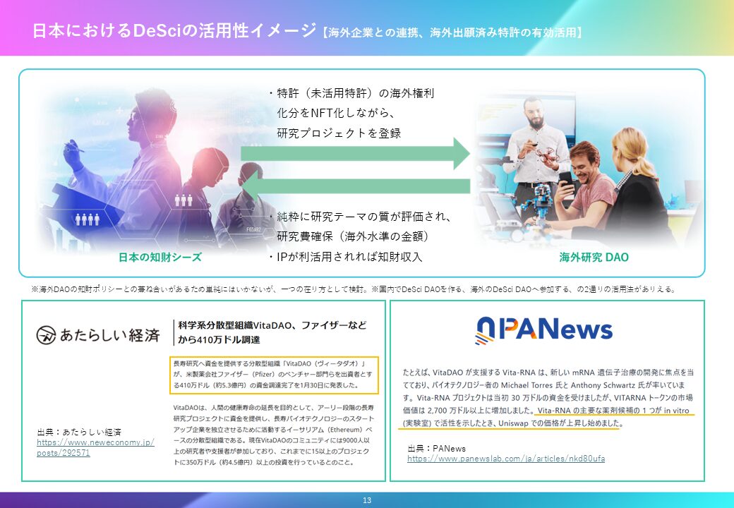 「日本におけるDeSciの活用性イメージ」について「研究活動における企業との連携」、「起業活動の促進」「海外企業との連携、海外出願済み特許の有効活用」を活用用途として取り上げ、言及します。