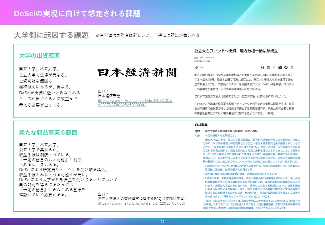 一方、学生は大学の所属ではないため、自由度が高くDAOに参加しやすいことが挙げられます。企業(大学発スタートアップ等)の場合、DeSciに参加するにあたりトークンに対する財務処理の検討・調整は必要となりますが、企業がビットコイン等を購入するケースは株式会社メタプラネットの取組が有名ですが手法として普及してきているため、動機づくりやトークンの流通方法は必要ながら制度的な大きな障害は発生しないと言えます。そのため、学生の起業DAOを最初に作り、大学発スタートアップ支援DAO、研究者起業DAO等と連結させていくシナリオが考えられます。