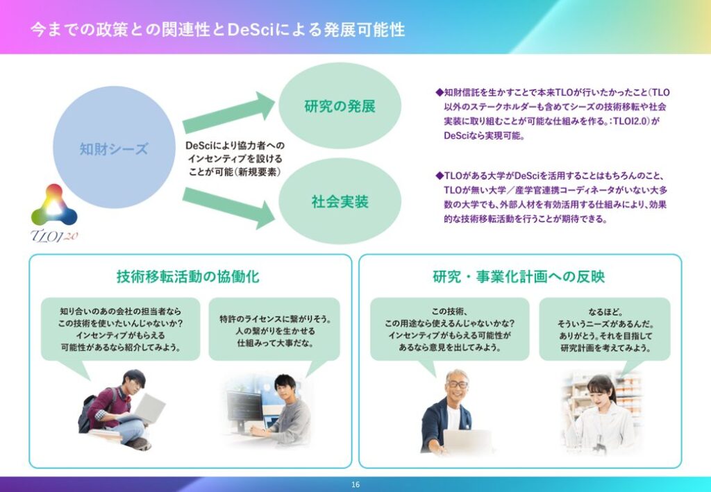 TLOがある大学がDeSciを活用することはもちろんのこと、TLOが無い大学/産学官連携コーディネーターがいない大多数の大学でも、外部人材を有効活用する仕組みにより、効果的な技術移転活動を行うことが期待できます。