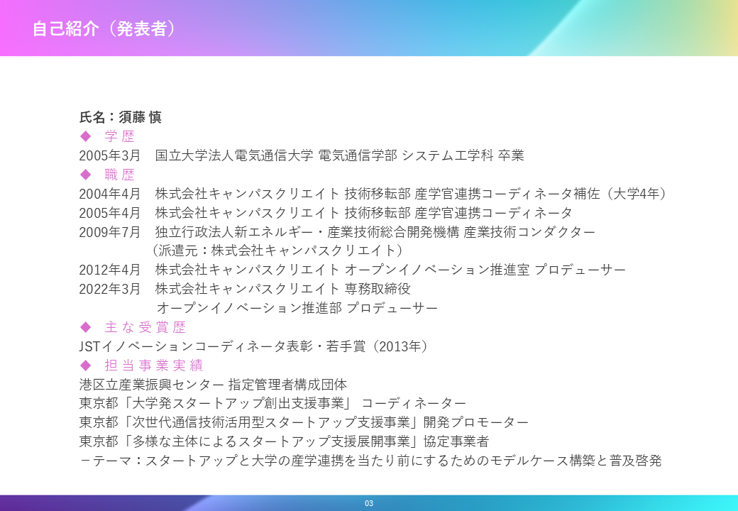 発表者である専務取締役・須藤 慎の自己紹介です。大学4年生から当社に入社し、NEDOにおける職務経験を挟みながら、21年間産学官連携業務を実施しているほか、自治体の産業振興事業にも数多く携わっています。