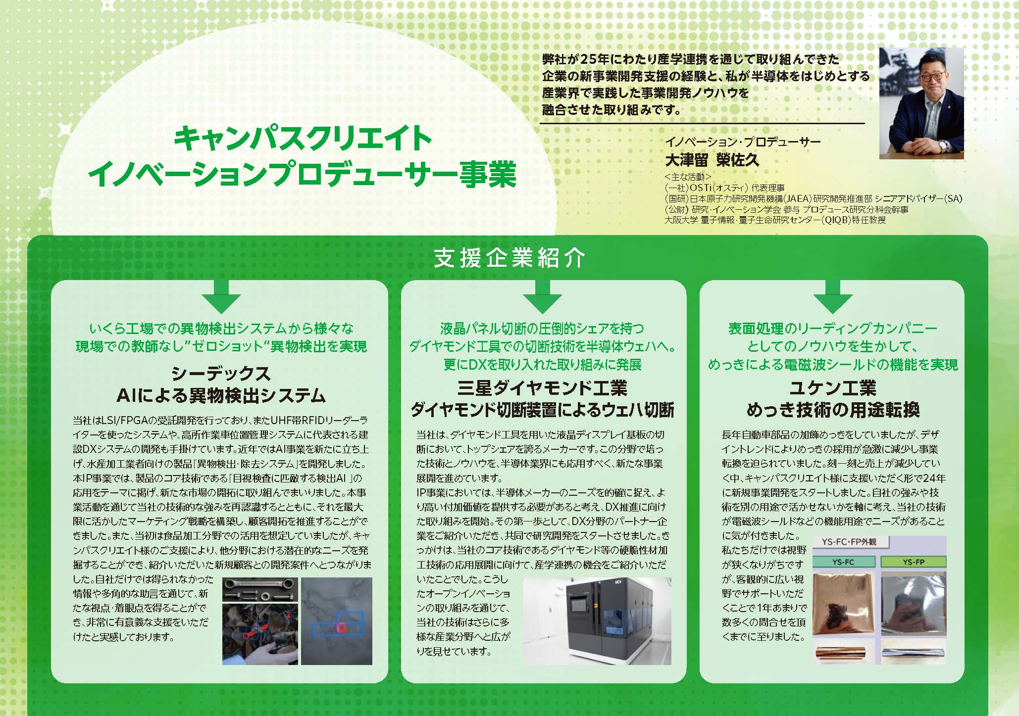 本事業で構築した実施体制は、当社が25年にわたり産学連携を通じて取り組んできた企業の新事業開発支援の経験と、大津留プロデューサーが半導体をはじめとする産業界で実践した事業開発ノウハウを融合させた取り組みです。