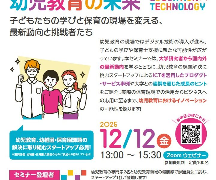 本セミナーでは、幼児教育の専門家による国内外の最新トレンドの紹介に加え、この分野の課題解決に挑むスタートアップが、ICTを活用したプロダクト・サービスや大学等との連携を通じた事業成長のポイントを紹介します。