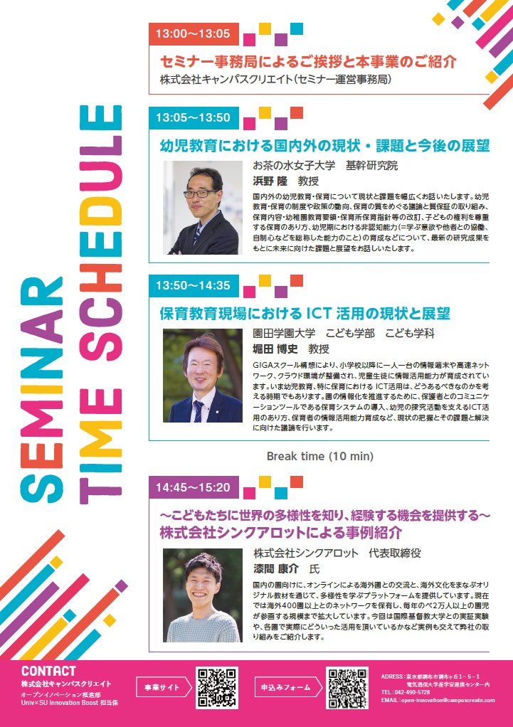 - セミナー名:テクノロジーがひらく幼児教育の未来:子どもたちの学びと保育の現場を変える、最新動向と挑戦者たち