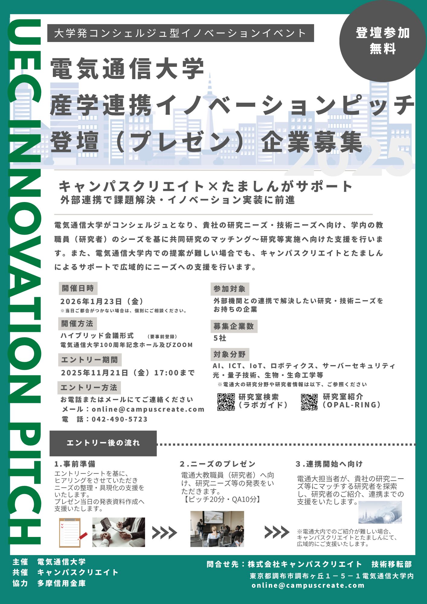 ※イベントへの参加や電気通信大学内でのご紹介が難しい場合、キャンパスクリエイトと多摩信用金庫にて広域的にご支援いたします。
