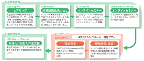 本プログラムは、2025年8月~2026年1月の6か月間にわたり実施中のハンズオン支援プログラムです。スタートアップのシンガポールを起点とした海外展開の可能性を見極め、戦略構築から現地協議までを一気通貫で支援します。