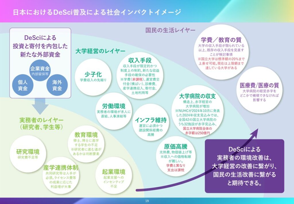 DeSciによる社会構造の再設計が進めば、大学の収入が安定し、研究者の待遇が改善され、イノベーションが加速します。新しい技術やサービスが次々に生まれることで産業の活力が高まり、社会全体が持続的に成長する好循環が生まれます。病院の赤字問題や学費の値上げといった課題は、大学附属病院や高等教育機関に関わるものとして、実際には大学の予算/収支という根本的な部分で互いに連動しています。こうした課題は、従来の中央集権型の資金調達や政策対応では限界があり、抜本的な改善には社会の基盤そのものを見直す必要があります。