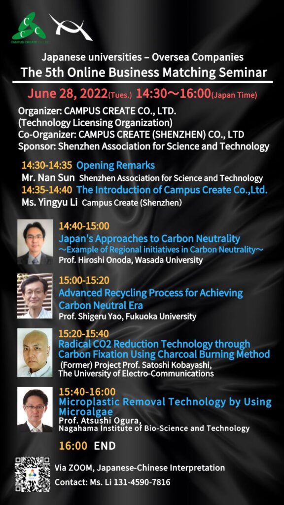 Campus Create Co, Ltd will hold the fifth event on July, 28, 2022, titled “Global Open Innovation–The Latest Research from Japan in Carbon Neutrality”.