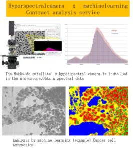 The hyperspectral camera developed by Hokkaido Satellite can obtain nearly 40 times more data than normal digital images, recent improvements in computational power of CPUs have allowed us to analyze the large-scale data of this hyper spectrum without artificially reducing the large scale data of the spectrum. Moreover, the use of general-purpose programming language, which is suitable for the use of machine learning, such as Python and R, has led to the development of a system that combines the conventional digital images with the hyper spectrum and the original AI, and has been applied to the pathological diagnosis of the system.