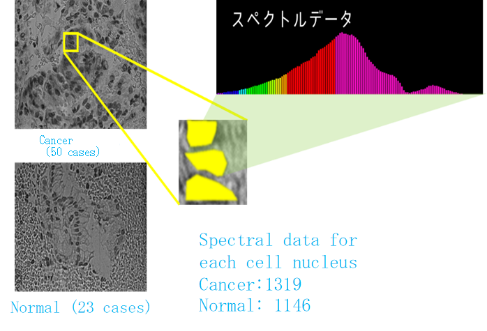 Malignant tumors are eventually diagnosed as “cancer” by microscopic observation of a pathologist. In particular, tumor of the pancreas is difficult to identify, and objective diagnostic index is required. By measuring microscopically magnified pancreatic cells with a hyperspectral camera, we succeeded in obtaining an accuracy of 98.7% at the cellular level. The analysis technique uses a machine learning technique such as SVM and clustering.