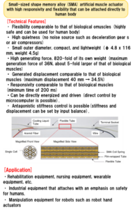 The system shown here was realized by a joint research between Kaneko Code Co., Ltd. and Nakamura Group in Department of Science and Engineering, Chuo University. This epoch-making system solved the issue of low responsivity, the top issue of SMA actuator. The response speed of this system is 5 times faster than that of conventional SMA actuator. Also, this system can be reduced in size and weight and can be attached directly to the human body thanks to its high flexibility. Therefore, this system is expected to have multiple applications including medical use. We welcome companies that are motivated to develop applied products and businesses using this technology.
