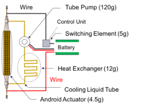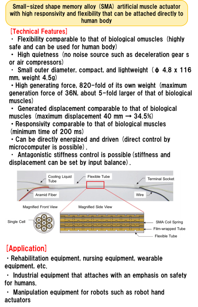 In the artificial muscle of this system, a special SMA coil spring is first placed inside a film tube of special shape and material, which is bundled together to form a single cell. By placing this cell into a flexible tube and flowing cooling liquid, we were able to improve the responsivity and flexibility and solved the problems of the conventional shape memory alloy (SMA) actuators, making it possible to apply the actuator to human-body sized devices.
