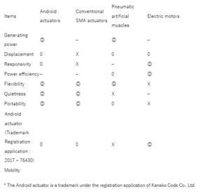 In contrast, shape memory alloy (SMA) actuators show shape memory effect by energizing and heating SMA wire or coil springs to be used as an actuator. Therefore, it is possible to directly energize and drive them, which makes them quiet and easy to reduce their size and weight, and shows highly flexible feature because the material itself is soft and flexible. On the other hand, because of the need to wait for cooling after heating, there was a problem with responsivity, and their use was limited to micromachines and other small devices that use thin wires with small heat capacity, where low generation force is not an issue. The following is a table comparing these actuators.