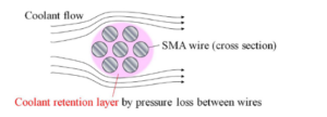 In this artificial muscle, multiple SMA coil springs are used in a bundle, but when multiple springs are bundled in this way, there was a problem that cooling efficiency decreases or cooling becomes uneven due to pressure loss and retention of cooling fluid between the SMAs upon flow (the pink area in the following figure shows the retention layer of the cooling fluid).