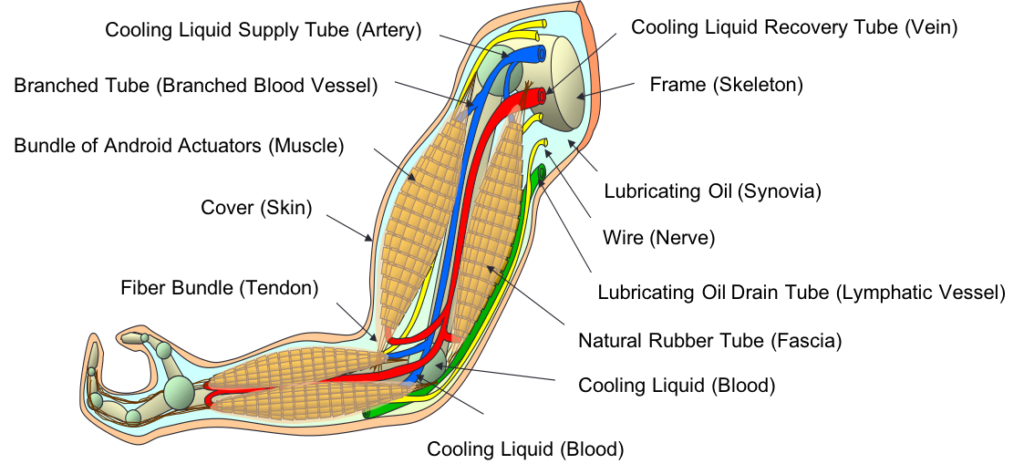 If the artificial muscle of this system is used, an artificial muscle prosthetic hand can be constructed as a system similar to the hands or arms of a living body, as shown in the figure below. This artificial muscle prosthetic hand consists of this artificial muscle actuator as the muscle part, a flexible tube as the myofascial part, cooling liquid as a vascular part of, and a control wire as a nerve part; therefore, this prosthetic hand corresponds to biological hands and arms.