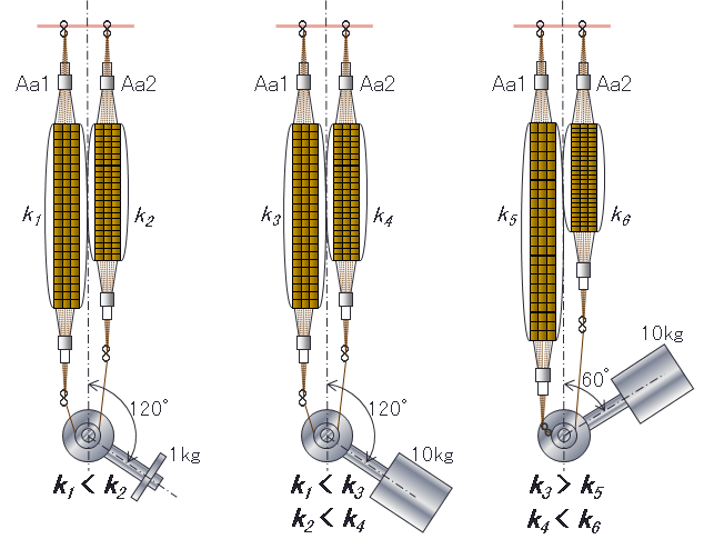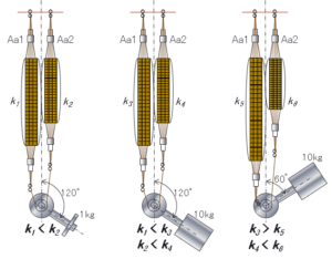 This artificial muscle can change its spring stiffness, i.e., the property that it tries to shrink, depending on the amount of power applied. This is called variable stiffness. Thus, by placing a pulley between two artificial muscles in an antagonistic state, as shown in the figure below, the balance of stiffness (k) can be altered by adjusting the balance of power applied to the left and right artificial muscles, creating a difference in contraction between the antagonistic artificial muscles. This difference in the amount of contraction is converted into a rotational motion by the pulley to drive the joint. This method makes it possible to hold objects of different weights at the same angle or height, as well as objects of the same weight. This is the antagonistic stiffness control. Since the biological muscles contract only in the axial direction, they usually take an antagonistic arrangement. Therefore, it can be said that antagonistic stiffness control is a control method commonly used in living body. The complex, precise, and powerful movements of living body are realized by this control method.
