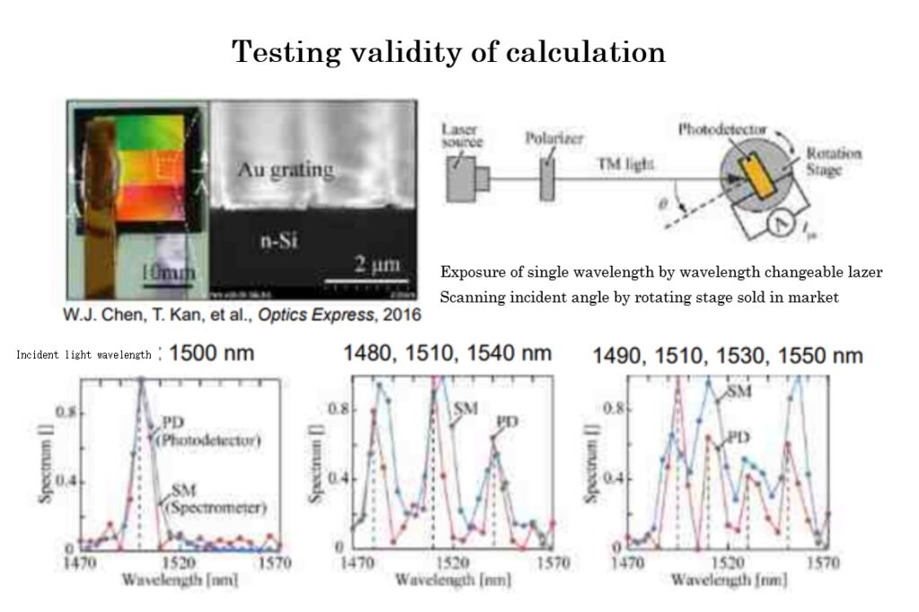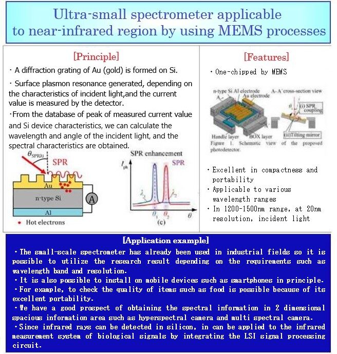 We also examine spectroscopic methods in the visible light region and in the longer wavelength region. The size of the small-scale spectrometer has some good prospect of several mm of thickness and about 1 cm wide so that it can also be installed on portable devices such as smartphones. The features are the simple manufacturing process, the cost effective, and excellent portability. We welcome anyone who is interested in realizing its practical use and joint research of this technology.