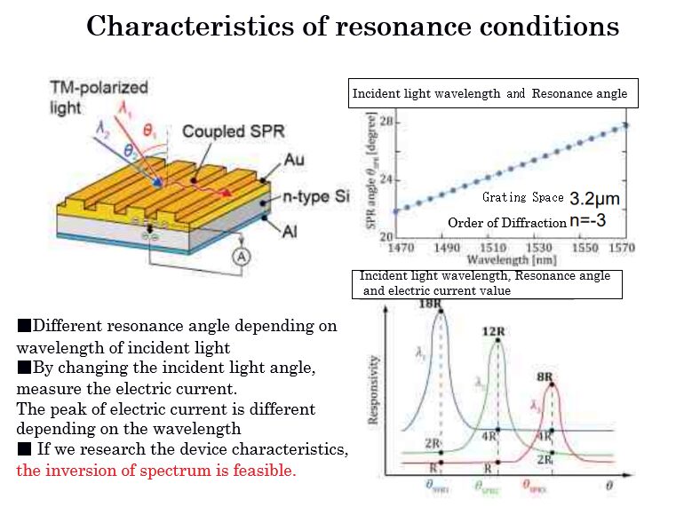 The conventional small-scale spectrometer detects light separated by a grating by a photodetector. Therefore, there is a limit to miniaturization because the optical path length is necessary to disperse the light. This technology solved the problem by using a detector to measure the current value and is integrated as a device. Also, we realized one-chipped incorporated actuator to operate the incident angle (On research about the way of controlling incident light angle as well as MEMS actuator).