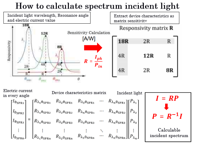 On the contrary, if we know the characteristics of the device and the peak of the current value when the light is irradiated, the wavelength and angle of the incident light are derived from the inverse matrix (inverse of the spectrum).