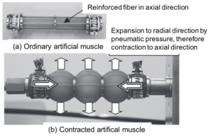 The contraction mechanism of this artificial muscle is that, by constraining the axial direction of the rubber tube with reinforcing fibers, the pressure of the fluid can be directly transmitted as the contraction force of the actuator. The pneumatic supply allows the tube pressure to be transmitted only in the radial direction and not in the axial direction. The rubber tube greatly expands in the radial direction and contracts in the axial direction. Expansion during contraction can be suppressed by the number of rings that are extrapolated into the tube. The following figure shows the artificial muscle before (a) and after (b) applying pneumatic pressure.