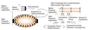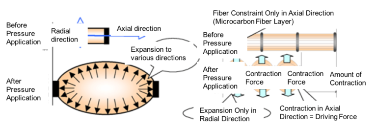The principle of the Mckibben type pneumatic artificial muscles is shown in the following left figure, and the principle of this artificial muscle is shown in the right figure.