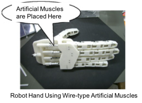 An active wire using artificial muscles is incorporated in this robot hand.