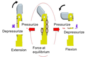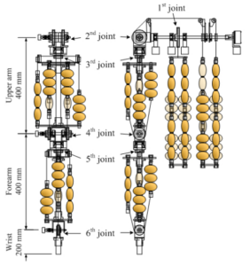 Because the artificial muscles contract in the axial direction, the manipulator is designed to move the joint by antagonism through the wires to the pulley. Pressurizing one of the antagonist muscles and decompressing another result in a pressure difference in the antagonist muscles. This pressure difference causes a difference in the amount of contraction. This difference is converted into a rotational motion by the pulley, which drives the joint.