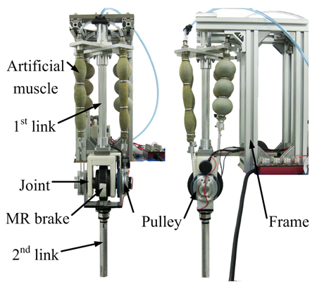 Thus, we tried to apply MR fluid to the joints of an artificial muscle manipulator instead of air pressure. MR fluid is a functional fluid that reversibly alters its apparent viscosity with a high response speed (in milliseconds) by applying magnetic field.